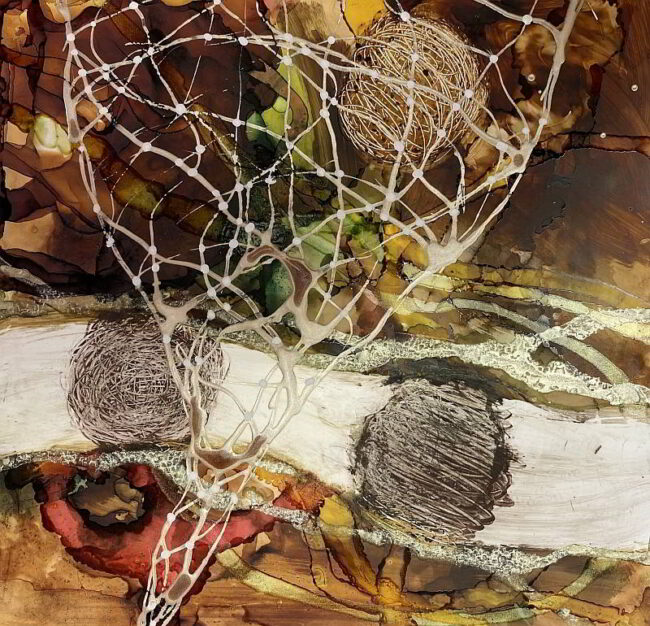 The work in this series was made using wax and broken glass. An encaustic painting is covered with clear wax except the areas shielded by pieces of broken glass. Once the wax has hardened, the glass is removed creating windows to the original painting. The work in this series was made using wax and broken…